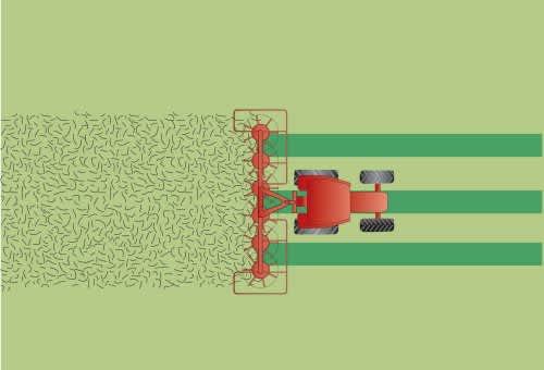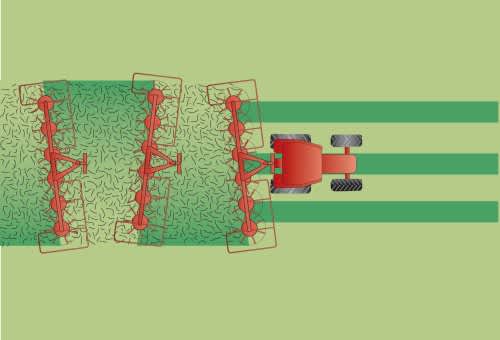 Для повышения производительности ворошилки Kverneland 8576 оснащены системой ворошения вдоль границы поля. Процесс контролируется механически из кабины трактора и поставляется в стандартной комплектации. Гидравлическое решение доступно в качестве опции. Маркер показывает положение оси.